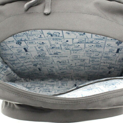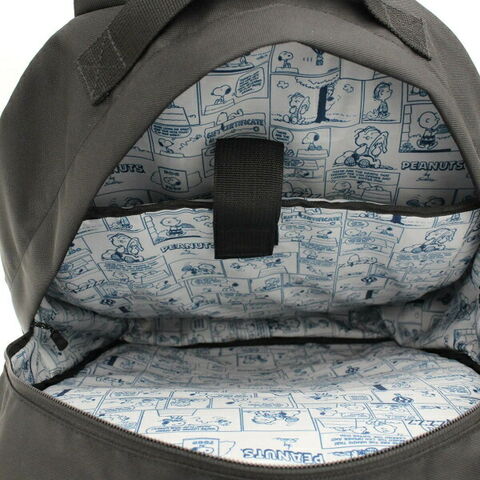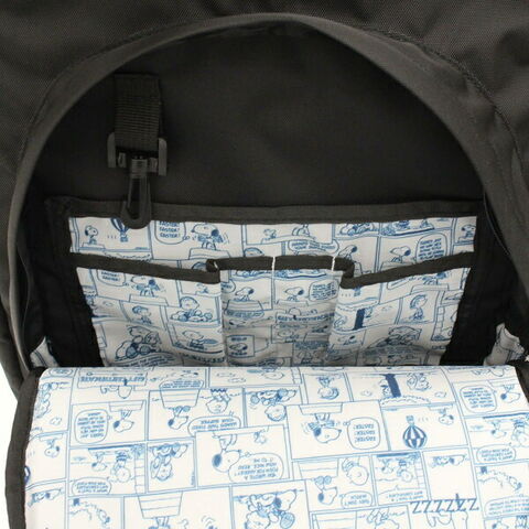 PEANUTSの文字が刺繍されたリュックサックです♪前面にはキーホルダー等を引っ掛けることのできるキーホックがついています♪片側側面にはDカンもついているので、お好きなキーホルダーをつけることができます♪前面ポケットのファスナートップがスヌーピーの形をしているのも可愛い!内装もスヌーピーのコミック柄プリントでおしゃれ。可愛いだけでなく機能性も抜群!メイン収納は2ルームに分かれており、荷物を仕分けして収納することが可能◎30Lの大容量で収納力抜群。A4サイズのノートもすっぽり収納できます。ノートPCやタブレットを入れるのに便利なクッションポケットも付き◎サイドには500mlペットボトルを入れられるメッシュサイドポケット付き。背面部分はメッシュ&クッションで背負い心地も快適◎