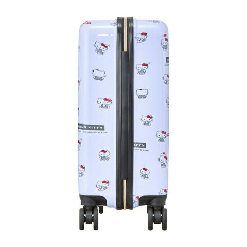 ハローキティの総柄デザインが可愛い。スーツケースのボディだけでなく内装もハローキティの総柄です。キャスターにはハローキティのお顔のシルエットが描かれています。スーツケース側面にはひょっこりと覗くハローキティのタグがついており、細部までこだわったデザインです。背面にはドリンクホルダー付きなのでペットボトル等を簡単に収納してスーツケースを持ち歩くことができます。内装のフタ側の仕切りはファスナーで閉じられるので、開閉時に荷物がこぼれる心配がありません。胴側はクロスベルト仕様なのでお荷物の荷崩れ防止になります。キャスターは安定した走行性を発揮する双輪キャスターで機能性も抜群。【内寸:H49×W36×D23cm】【重量:約3kg】【容量:約35L(宿泊目安:約1~3泊)】