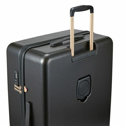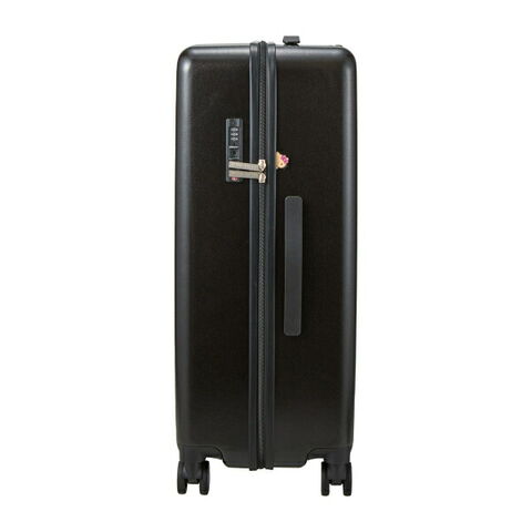 日焼けデザインのハローキティのスーツケース。日焼けデザインのハローキティがピンクのヒョウ柄リボンをつけたお顔がかわいい。スーツケースのブラックのボディに映えるピンクのロゴも大人かわいいデザインです。キャスターにはハローキティのお顔のシルエットが描かれています。スーツケース側面にはひょっこりと覗くハローキティのタグがついており、ファスナートップにはHELLO KITTYロゴが刻印されています。内装はヒョウ柄。細部までこだわったデザインです。デザインだけでなく、実用性も抜群。背面にはカップホルダー付きなのでペットボトル等を簡単に収納してスーツケースを持ち歩くことができます。内装のフタ側の間仕切りはファスナーで閉じられるので、開閉時に荷物がこぼれる心配がありません。胴側はバックル留めの間仕切りとクロスベルト仕様なのでお荷物の荷崩れを防止することができます。キャスターは安定した走行性を発揮するダブルキャスターで機能性も抜群。しかも、サスペンション付きキャスターなので、振動が手に伝わりにくく長時間移動しても疲れにくい!ロックは番号で開閉する『ダイヤルロック』タイプ。さらに、アメリカ方面への旅行時、鍵をかけたまま航空会社に荷物を預けることが可能な『TSロック』も搭載しています。【内寸:H68×W48×D28cm】【重量:約4.6kg】【容量:約83L(宿泊目安:約5~7泊)】