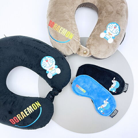 旅行のお供にぴったりなドラえもんのネックピローです。ドラえもんのイラストやDORAEMONの文字が刺繍がとってもキュート♪首を安定させて楽な姿勢を保ち、快適な睡眠をサポートしてくれます!適度な硬さの低反発タイプで、柔らかく肌触りのいい生地を使用しているので使い心地バツグン☆スーツケースやバッグに引っかけておくことができるようにボタン付きフックもついていて便利♪飛行機・電車・バス・車など、乗り物での移動時間が長い方は一つ備えておくと安心です☆彡