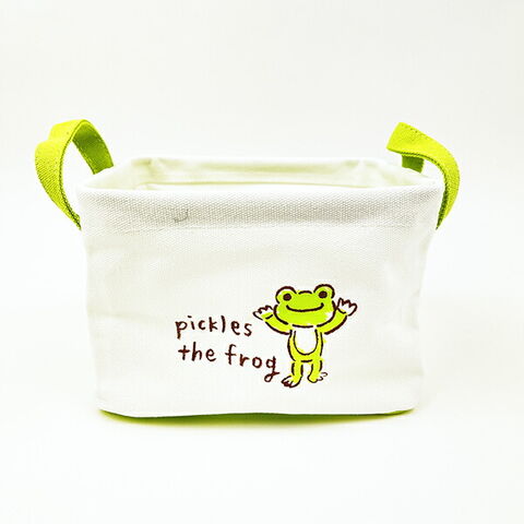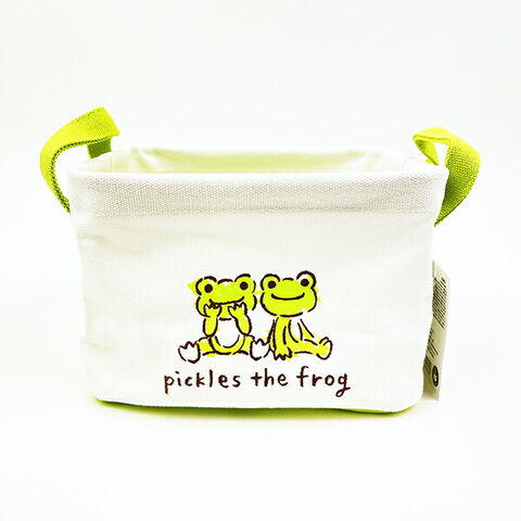 かえるのピクルスの小さめサイズで可愛らしいストレージボックスです。ワイヤー入りでしっかり自立し、使わないときはたたんでコンパクトにもなっちゃいます♪衣類やタオル、おもちゃの収納に活躍すること間違いなし!持ち手つきで、持ち運びにも便利な収納ボックスです☆