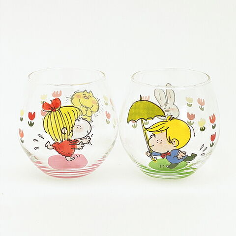 水森亜土の世界観がギュッと詰まっているデザインの丸グラスです。ジュースやお茶を入れてみるとまるでデザインが浮いているように見える♪専用の箱に入っているのでプレゼントにもおすすめです!カラー違いで女の子もございますので揃えても可愛いですよ♪