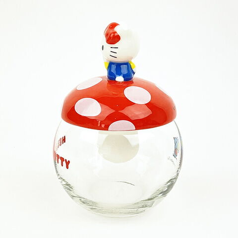 ハローキティのきのこキャニスターです。小物やキャンディなどを入れるのにぴったり♪ガラスなので中身も確認しやすいです!きのこの上にいるキティちゃんが可愛い☆
