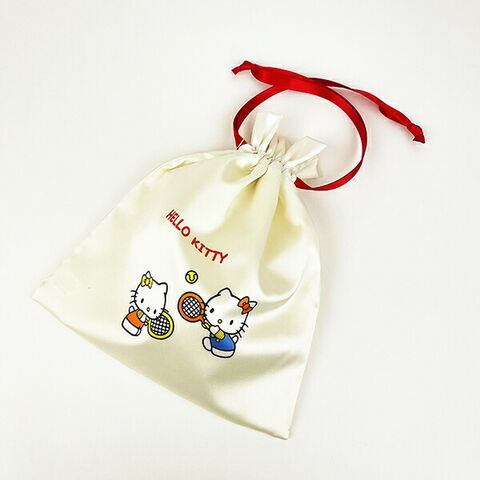 ハローキティのフレンズ巾着です。お菓子や小物入れにぴったりのサイズ感☆紐が差し色になっていて注目◎光沢感のあるサテン生地がとってもキュートです♪