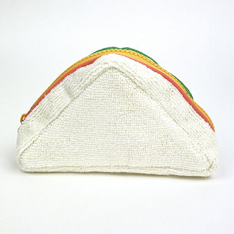 架空の純喫茶「喫茶ロマンス」をイメージしたレトロなシリーズ◎喫茶店でおなじみのハム・きゅうり・タマゴのシンプルなサンドイッチをイメージしたポーチ♪本体はパイル生地でふわふわした食パンを表現☆彡底面にはさりげなく共色でSANDWICHの文字を刺繍しています☆彡