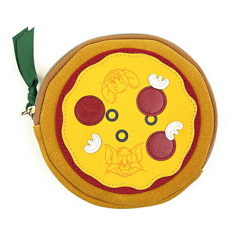 リアルなピザを再現したラウンド型ポーチ。サラミやマッシュルーム、オリーブをプリントや生地で表現しています♪バジルをイメージしたリボンもポイントです☆チーズの中にはトムとジェリーが隠れていてかわいい♪ファスナー開閉仕様で大きく開いて使い勝手も良いポーチです。