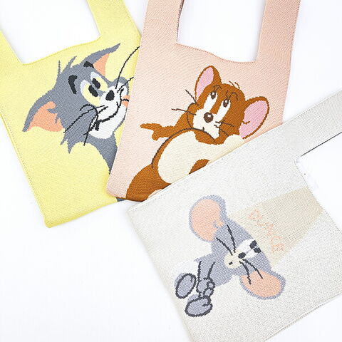 トムとジェリーの身軽に移動したいランチタイムやお散歩のお供にぴったりなニットバッグです。ちょっとクスッと笑えるアートをパステル調のかわいい色合いで編み上げました♪マチもあって収納力抜群です☆スマホ、お財布、メイクポーチ、飲み物など必要なものだけパッと入れて持ち運びできます♪お好きなキャラクターで揃えたり、ご家族で揃えても可愛い♪とってもキュートなシリーズなのでぜひ同デザインの巾着やハートポーチチャームと合わせてお使いください☆彡