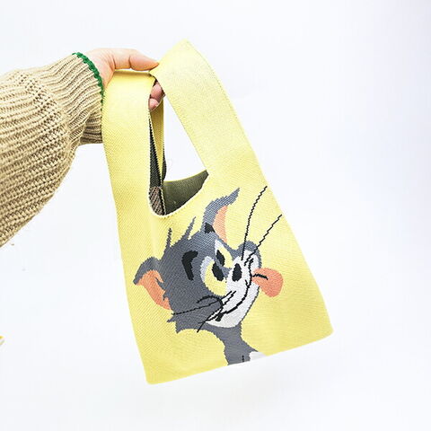 トムとジェリーの身軽に移動したいランチタイムやお散歩のお供にぴったりなニットバッグです。ちょっとクスッと笑えるアートをパステル調のかわいい色合いで編み上げました♪マチもあって収納力抜群です☆スマホ、お財布、メイクポーチ、飲み物など必要なものだけパッと入れて持ち運びできます♪お好きなキャラクターで揃えたり、ご家族で揃えても可愛い♪とってもキュートなシリーズなのでぜひ同デザインの巾着やハートポーチチャームと合わせてお使いください☆彡