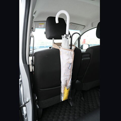 濡れた傘をそのまま収納できる、車内用傘ポケットです。ヘッドレストに持ち手を通して引っ掛けるだけ。長傘だけでなく、ビニールポケット部分には折り畳み傘も入るので便利です♪