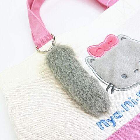 サンリオキャラクターズのネコちゃんシリーズ、キャットシリーズです。こちらはニャニィニュニェニョンのミニトートです。表はふわふわのニェのお顔。ふわふわのシッポのチャーム付き♪ランチやデイユーズに◎