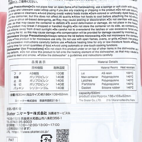 素材:フタ:AS樹脂(耐熱温度100度)、本体・止具・仕切:ポリプロピレン(耐熱温度140度)、パッキン:シリコーンゴム(耐熱温度140度)