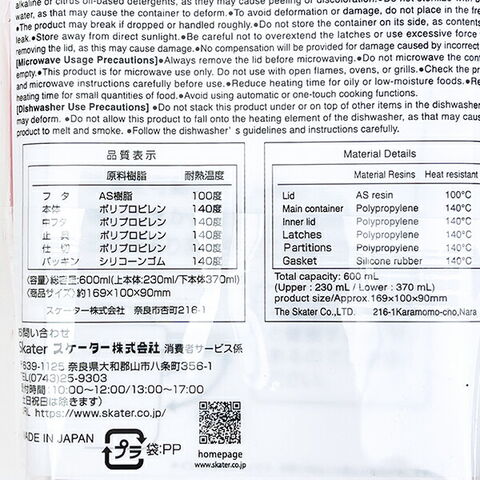 素材:フタ:AS樹脂/耐熱温度100度、本体、中フタ:ポリプロピレン/耐熱温度140度、止具:仕切:ポリプロピレン/耐熱温度140度、パッキン:シリコーンゴム/耐熱温度140度