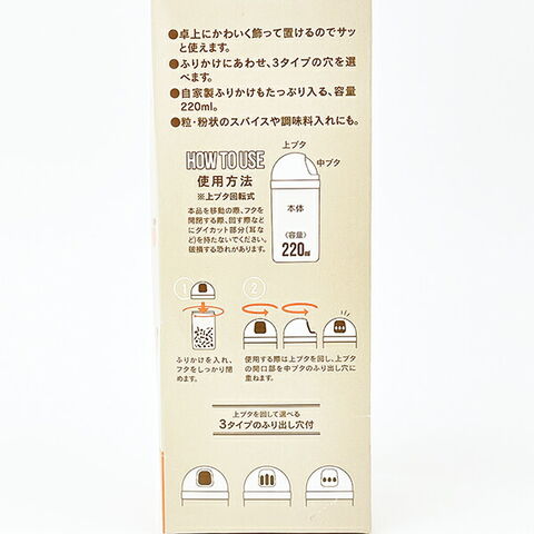 卓上にかわいく飾って置けるのでサッと使えます♪ふりかけにあわせ、3タイプの穴を選べます♪自家製ふりかけもたっぷり入る、容量220ml◎粒、粉状のスパイスや調味料入れのもお使いいただけます♪キッチン周りもミッフィーでまとめても可愛いですよ♪【容量:220ml】
