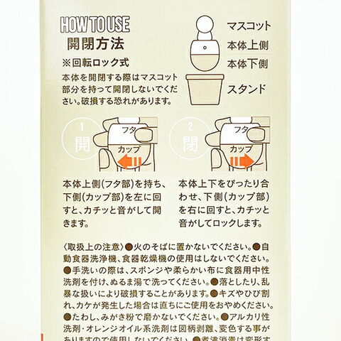 素材:本体:ポリプロピレン120度、マスコット:ABS樹脂80度、スタンド:ポリプロピレン120度