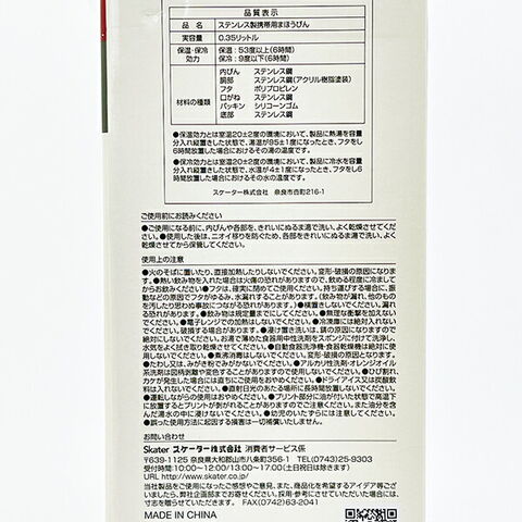 素材:中びん:ステンレス銅、胴部:ステンレス銅(アクリル樹脂塗装)、フタ:ポリプロピレン、口がね:ステンレス銅、パッキン:シリコーンゴム、底部:ステンレス銅