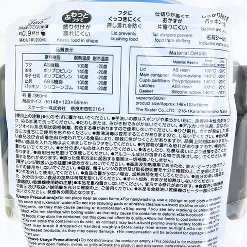 素材:フタ:AS樹脂(耐冷温度-20度 /耐熱温度100度)、本体・中子・仕切:ポリプロピレン(耐冷温度-20度/耐熱温度140度)、止具:ABS樹脂(耐冷温度-20度/耐熱温度100度)、パッキン:シリコーンゴム(耐冷温度-20度/耐熱温度140度)