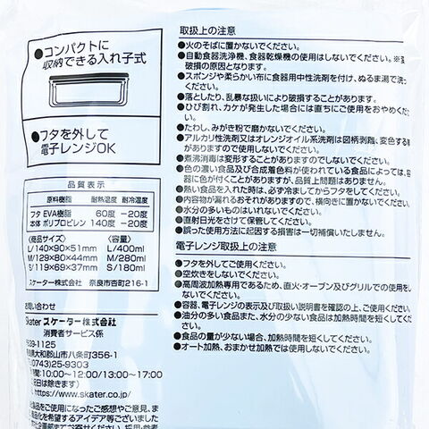 素材:フタ:EVA樹脂(耐冷温度-20度/耐熱温度60度)、本体:ポリプロピレン(耐冷温度-20度/耐熱温度140度)