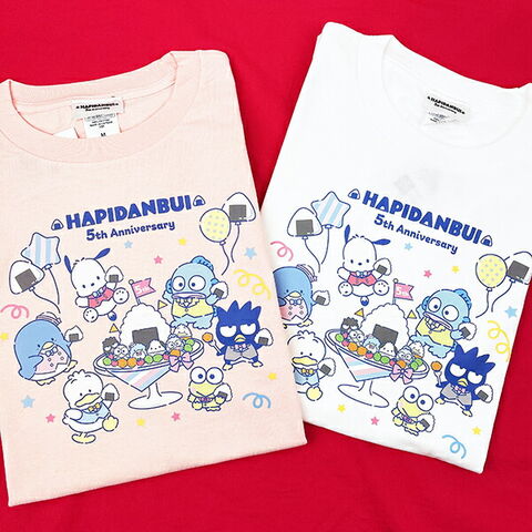 はぴたんぶいの5周年デザインが可愛いTシャツです。はぴたんぶいたちがおにぎりになったデザインがとっても可愛いです♪普段使いにはもちろん、おともだちとお揃いにしてお出かけするのもおすすめ☆はらまきとおにぎりの2種類デザインがあるのでぜひお好きなデザインをお選びください♪ 【サイズ:M(身丈70cm×身幅52cm) 】