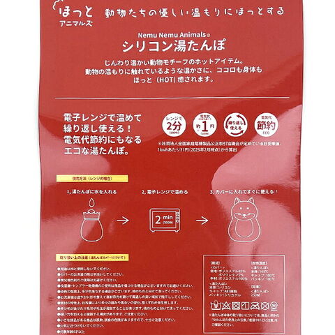 じんわり温かい動物モチーフのホットアイテム♪癒し効果抜群の動物たちの温かさで心も身体もほっとできます。電子レンジで温めて繰り返し使えて電気代節約にもなるエコな湯たんぽです。※カバーの洗濯の際は手洗いして下さい。※素材:【カバー:側地/ポリエステル95%、ポリウレタン5%、中材/ポリエステル100%、湯たんぽ:本体/シリコン、キャップ/ABS樹脂、パッキン/シリカゲル】
