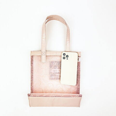 フロッキー加工を施したメッシュ生地がおしゃれなフラワーシリーズ。小さめマチ付きトートはちょっとしたおでかけに大活躍♪こちらはピンクです。