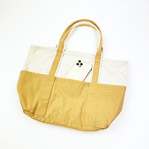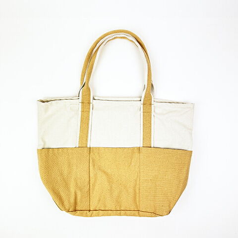 裁断くずや廃棄衣料を生地に使用しており、色別に仕分けし、もとの繊維の色を活かした新たな生地にするため再度染色するため水や化学薬品、染料を使用しない環境に優しいテキスタイル◎底面から立ち上がった配色部分がポケットがあり前後面にそれぞれ3つずつ、計6つのオープンポケット。A4サイズの書類や教科書など楽々入ります☆彡Lサイズのバッグもあるので親子でペアーで持って可愛いですよ♪