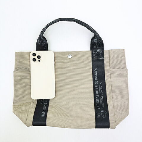 スヌーピーがドッグハウスの上でくつろぐデザインが可愛いトートバッグです。軽量で普段使いにちょうどよいサイズの「デリ」。長財布、スマホ、ボトル、エコバッグなど、必要なモノがひと通り収まり便利◎口元はドットボタンでサッと開閉。ざっくりハリのあるポリエステル素材が、カジュアルスタイルにぴったり♪両サイドのポケットには、ボトルを立てて収納可能なのでよく使うアイテムを入れるのに最適☆内側にも1箇所、スマホサイズのポケット付きなのが嬉しいポイントです♪