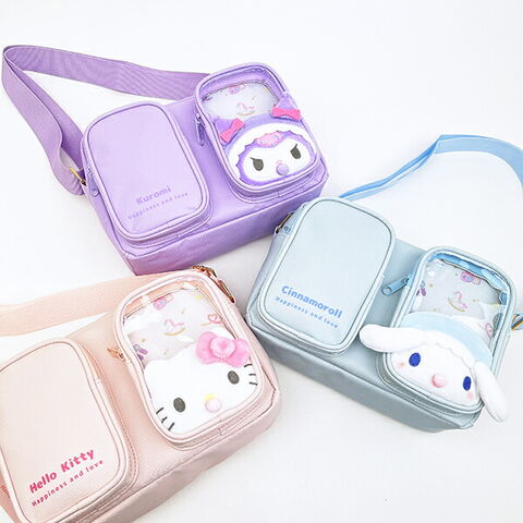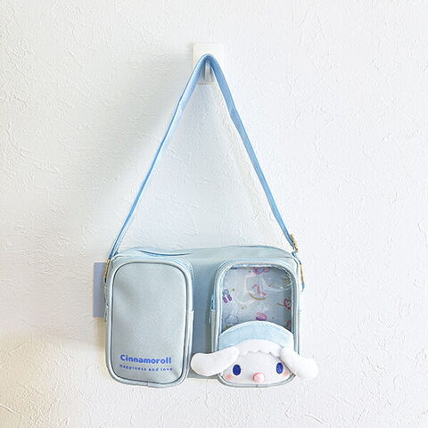 シナモロールの収納に便利な立体ポケット2個付きのショルダーバッグです。1ポケットの前面はクリアPVCで入れた物が見えるのでぬいぐるみやマスコットなどを入れて推し活にも◎ショルダー紐は長さ調節可能。内生地も可愛いなんて嬉しすぎます♪ベビーシナモンの可愛いお顔がふわふわで癒されます☆彡
