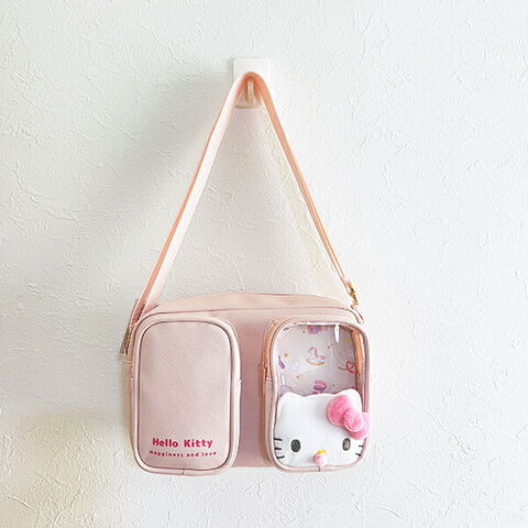 ハローキティの収納に便利な立体ポケット2個付きのショルダーバッグです。1ポケットの前面はクリアPVCで入れた物が見えるのでぬいぐるみやマスコットなどを入れて推し活にも◎ショルダー紐は長さ調節可能。内生地も可愛いなんて嬉しすぎます♪ベビーキティの可愛いお顔がふわふわで癒されます☆彡