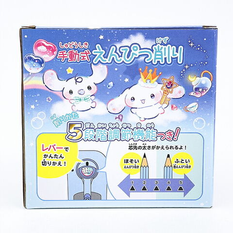 シナモロールの手動式えんぴつ削りです。レバーで簡単切り替え!芯先の太さが変えられるよ♪学生さんには必需品ですよね☆とっても可愛いデザインなので、デスクの上に置いておくだけでも癒されそうです☆