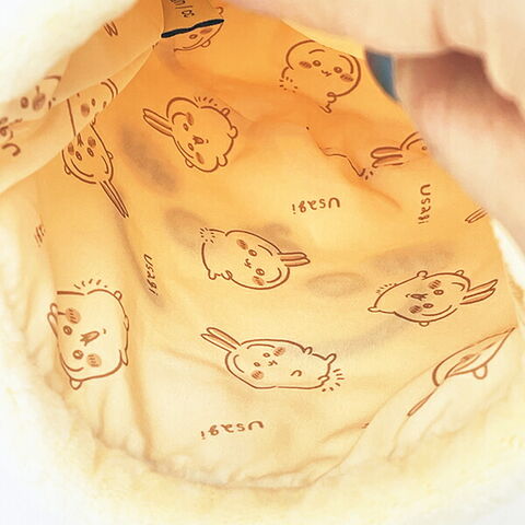 ちいかわ(うさぎ)のふわふわ素材のフェイス巾着です。マチ付きなので小物の持ち運びにも便利☆内生地まで可愛いなんてずるい~!!愛らしい表情がとてもキュートな巾着です♪
