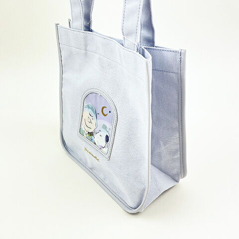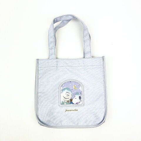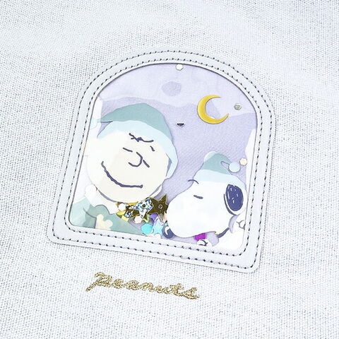 小窓からオヤスミ前のスヌーピー達が覗くデザインです。キラキラスパンコールが動いてカワイイ♪ランチバッグやデイユーズバッグとして◎