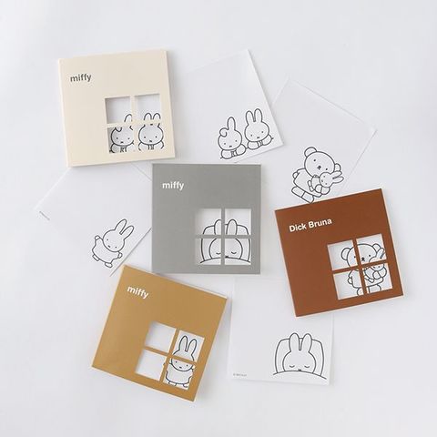 大人のためのミッフィーステーショナリーシリーズ。台紙の窓抜き部分からミッフィーや仲間たちがこんにちは♪20枚入りです。