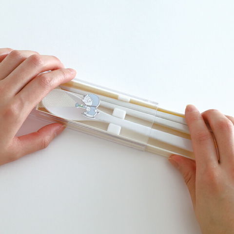 開閉しやすいスライド式ケース。シリコンパーツ付きで持ち運ぶときにカチャカチャ音が鳴りません。箸とスプーンに抗菌加工が施されています。※食洗機対応 箸・スプーン:180mm