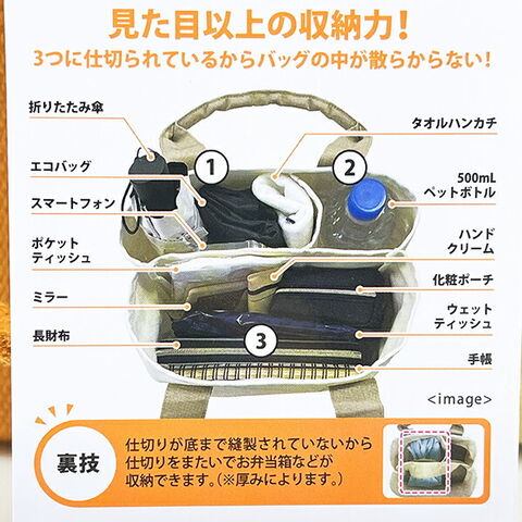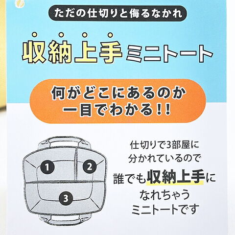 水森亜土の収納上手トートバッグです。何がどこにあるのか一目でわかる!!仕切りが3部屋に分かれているので誰でも収納上手になれちゃいます♪見た目以上に収納力抜群です☆彡小さめのランチボックスなら収納もできちゃいます♪♪