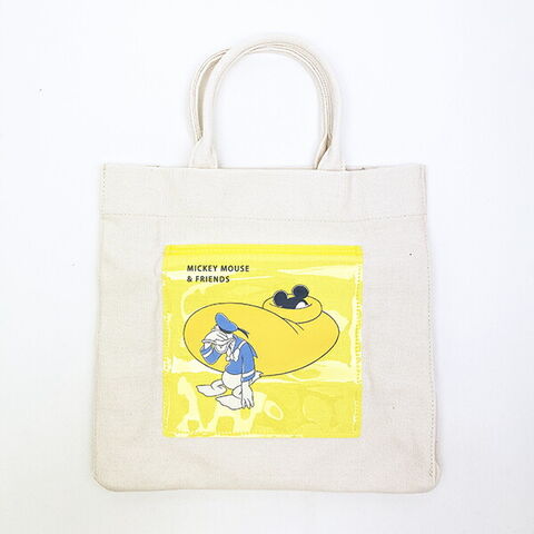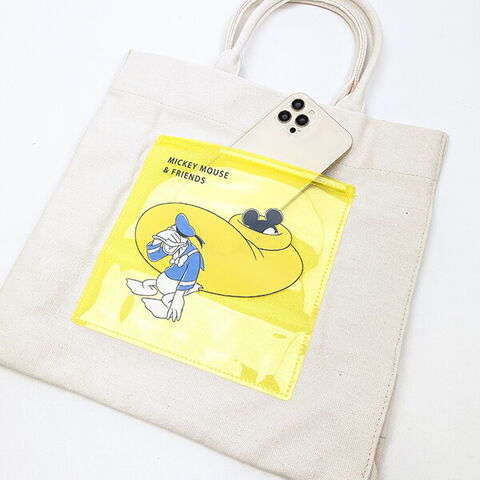 ミッキー&ドナルドのデザインが可愛いトートバッグです。ちょっとしたお出かけに便利なサイズ感♪表面にはPVCのポケット付き☆500mlのペットボトルも入るので使い勝手もバツグンです!