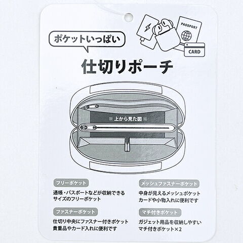 ポケットがいっぱいある仕切りポーチです。通帳やパスポートなど収納できるフリーポケットや中身が見えるメッシュポケット。カードや小物入れに便利◎ファスナーポケットには仕切り中央にファスナー付きポケットがあり貴重品やカード入れにぴったり♪マチ付きポケットには、ガジェット用品を収納しやすい◎旅行先でも可愛いデザインポーチで楽しもう♪