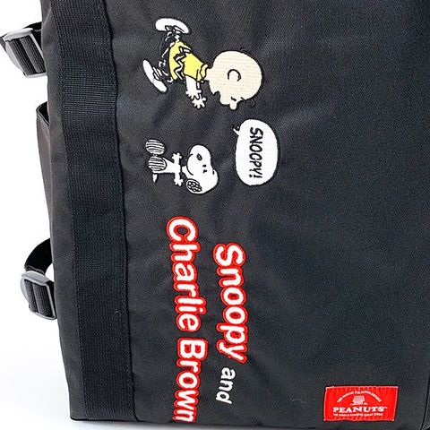 口が大きく開きいろいろ入るボックスリュック。本体の表側と裏(背中)側のサイドにはそれぞれファスナー開閉式のポケットが付いていて収納力UP!両サイドもポケット状になっています。背中が当たる部分はやわらかなメッシュ生地を使用。ピーナッツ各キャラクターの大きな刺繍と、ワンポイントのPEANUTSロゴのワッペンがとってもかわいい♪通勤や通学の普段使いはもちろん、お泊りや旅行、ハイキングやアウトドアなどいろんな場面で使えます!