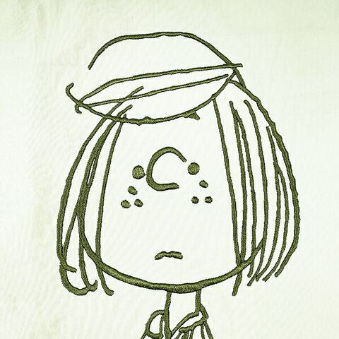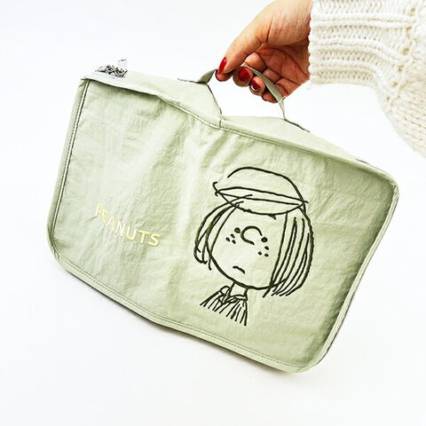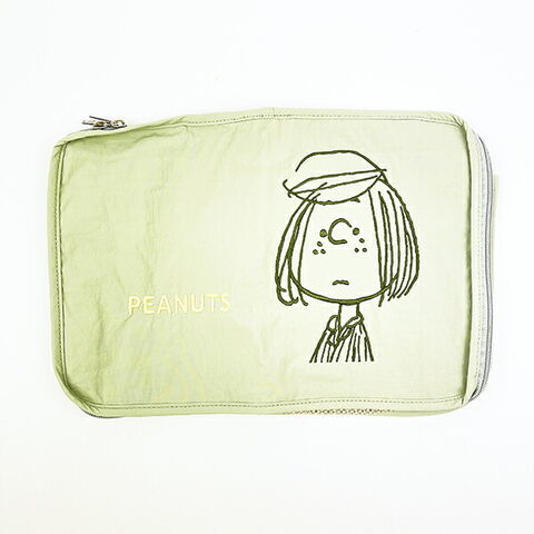 ピーナッツの仲間たちの刺繍デザインがシンプルだけどおしゃれな収納ポーチです。一部がメッシュ素材になっているので通気性もバッチリ◎フリーポケットも付いていて使いやすい◎こちらはペパーミントパティデザインです。