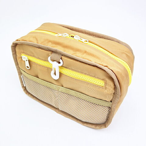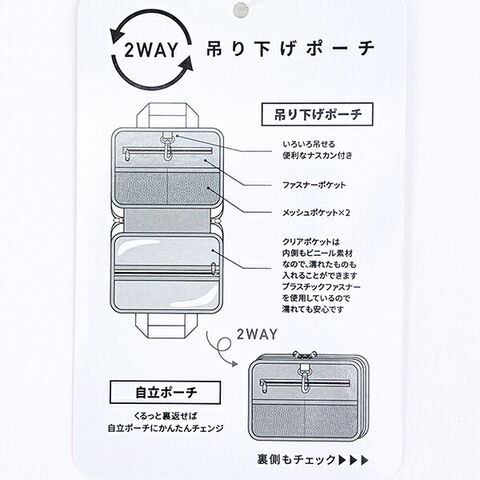 吊り下げポーチ・自立ポーチの2WAYタイプのポーチです。荷物が多くなりがちな旅行の際に吊り下げポーチはとっても大活躍!クリアポケットは内側もビニール素材なので、濡れたものも収納できます♪