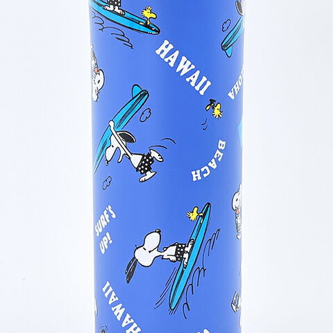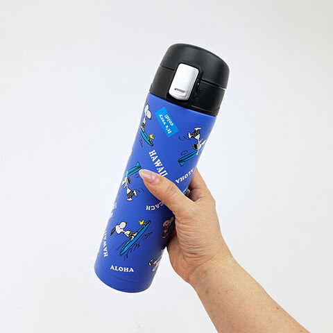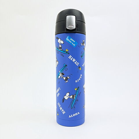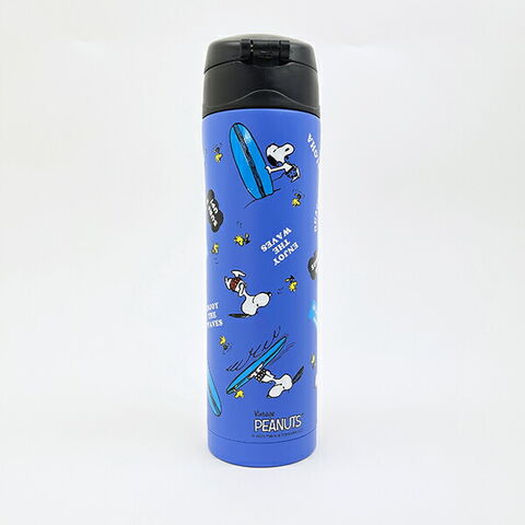 サーフィンを楽しんでいるスヌーピーのデザインが可愛い水筒です!ワンプッシュオープンタイプなので、小さいお子様でも楽々!6時間の保温・保冷効果があり、1年中使っていただけます☆彡 ※食器洗浄機・食洗機 使用不可!
