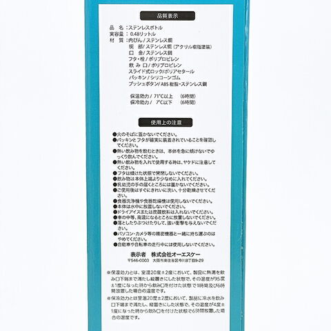 素材:内ビン:ステンレス鋼、胴部:ステンレス鋼(アクリル樹脂塗装)、口金:ステンレス鋼、フタ・栓:ポリプロピレン、飲み口:ポリプロピレン、スライド式ロック:ポリアセタール、パッキン:シリコーンゴム、プッシュボタン:ABS樹脂・ステンレス鋼
