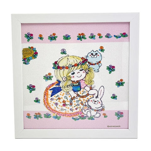 水森亜土のイラストが描かれたちりめん生地を白い額縁に入れた、インテリアにピッタリな額装です。亜土ちゃんの優しい世界観をお家でも楽しんでくださいね♪