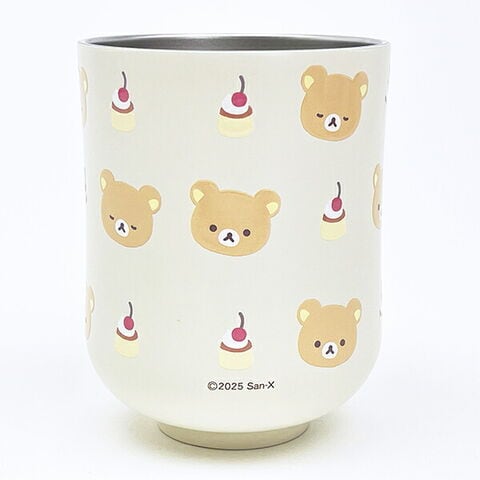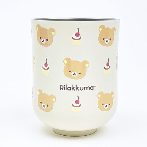 リラックマのステンレス真空二重湯のみです。 あたたかい飲み物も冷たい飲み物も、美味しい温度が長持ち♪ 外側も熱くならず、結露もしにくいのでテーブルが濡れなくて汚れません。生クリームとサクランボがちょこんとなったプリンとリラックマのデザインはとっても可愛い♪ ステンレスタイプの湯呑も珍しく、楽しくお茶が出来そう♪ ※電子レンジ・食洗機 使用不可!