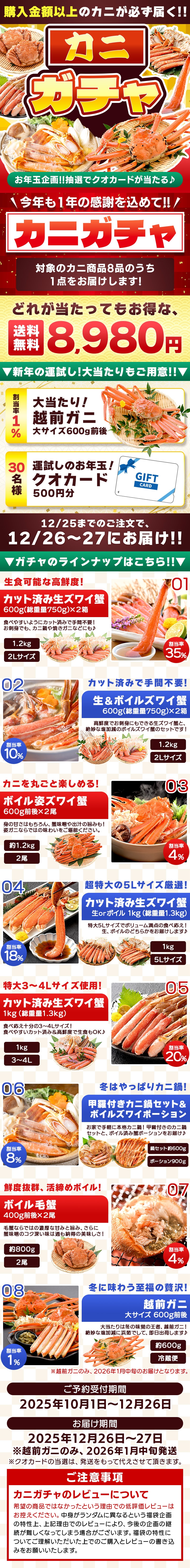 | 以下の中から「抽選で1点」をお届けします。 カット済生ズワイ蟹600g×2箱、 カット済生ズワイ蟹600g&カット済ボイルズワイ蟹600g、 ボイル姿ズワイ蟹600g前後×2尾、 5Lカット済生ズワイ蟹1kg、 3-4Lカット済ボイルズワイ蟹1kg、 甲羅付き蟹鍋セット約600g&ボイルズワイポーション900g、 ボイル毛蟹400g前後×2尾、 越前ガニ600g前後 ※お届けは12/26~27となります。 ※越前ガニのみ、お届けは1月中旬となりますのでご了承ください。 (海の状況により漁が制限される場合があるため) |