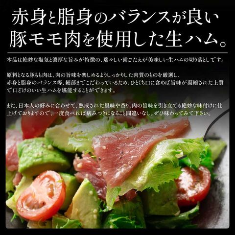 | 本品は、生ハムのスライスを作る際に出来る端材の部分を集めた、 お徳用の訳あり商品です。 端材部分はスライスしきれなかった塊部分の為、味、品質ともに正規品と変わらない商品となっております。お得に生ハムを楽しみたい方は、ぜひお買い求めください。 |