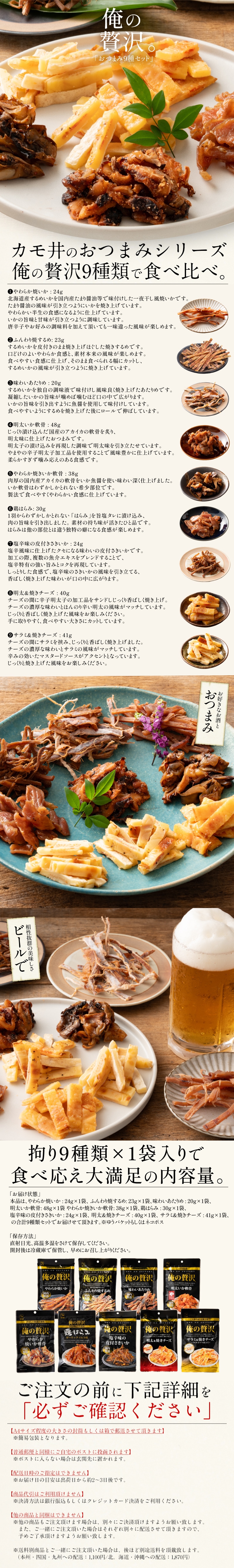 | 拘り9種類×1袋入りで 食べ応え大満足の内容量。カモ井のおつまみシリーズ俺の贅沢9種類で食べ比べ。 |