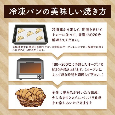 | 解凍後、180~200℃のオーブンで約20分焼いてからお召し上がりください。 ※ご使用のオーブンによって温度、焼き時間を調整してください。 ※解凍せずに焼成も可能ですが、ご家庭用オーブンレンジの場合、解凍後に焼成していただく方が綺麗に仕上がります。 |