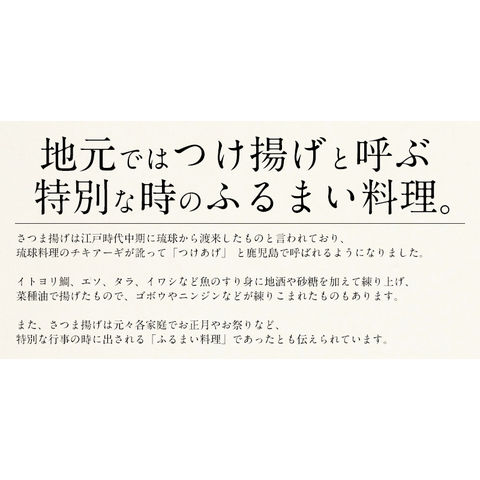 | ●蓮根天[魚肉すり身(外国製造)、蓮根、豆腐、澱粉、砂糖、植物性タン白、食塩、鹿児島産地酒(灰持酒)、発酵調味料、卵白、植物油脂]●ごぼう天[魚肉すり身(外国製造)、ごぼう、豆腐、澱粉、砂糖、植物性タン白、食塩、鹿児島産地酒(灰持酒)、発酵調味料、卵白、植物油脂]●にら天[魚肉すり身(外国製造)、にら、豆腐、澱粉、砂糖、植物性タン白、食塩、鹿児島産地酒(灰持酒)、発酵調味料、卵白、植物油脂]●あおさ蒲鉾[魚肉すり身(外国製造)、澱粉、卵白、食塩、ぶどう糖、あおさ]●特上揚[魚肉すり身(外国製造)、澱粉、砂糖、植物性タン白、鹿児島県産地酒(灰持酒)、発酵調味料、食塩、ぶどう糖、卵白、植物油脂]●上棒天[魚肉すり身(外国製造)、澱粉、砂糖、植物性タン白、鹿児島県産地酒(灰持酒)、発酵調味料、食塩、ぶどう糖、卵白、植物油脂]●イワシ棒天[魚肉すり身(外国製造)、豆腐、澱粉、砂糖、植物性タン白、鹿児島県産地酒(灰持酒)、発酵調味料、食塩、卵白、植物油脂]●紅生姜天[魚肉すり身(外国製造)、紅しょうが、澱粉、卵白、食塩、鹿児島県産地酒(灰持酒)、砂糖、ぶどう糖、植物油脂]/調味料(アミノ酸等)、(一部に小麦・卵・牛肉・大豆・ゼラチンを含む) |