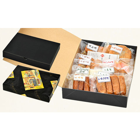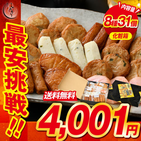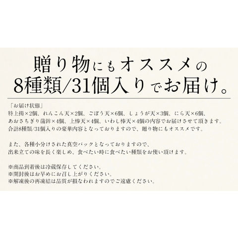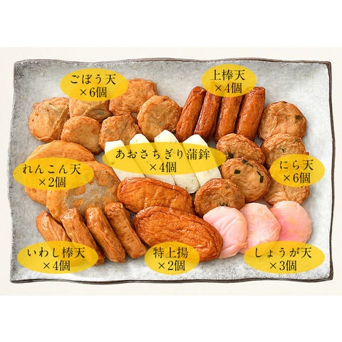 | 8種類31個入り(特上揚×2個、れんこん天×2個、ごぼう天×6個、しょうが天×3個、にら天×6個、 あおさちぎり蒲鉾×4個、上棒天×4個、いわし棒天×4個) |