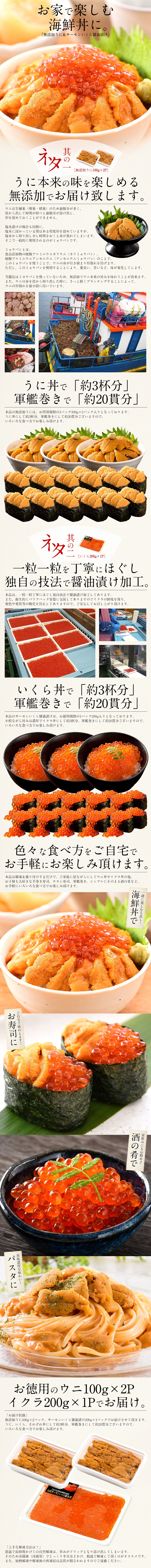 | 無添加ウニ200g(100g×2パック)、北欧サーモンいくら醤油漬け200g |